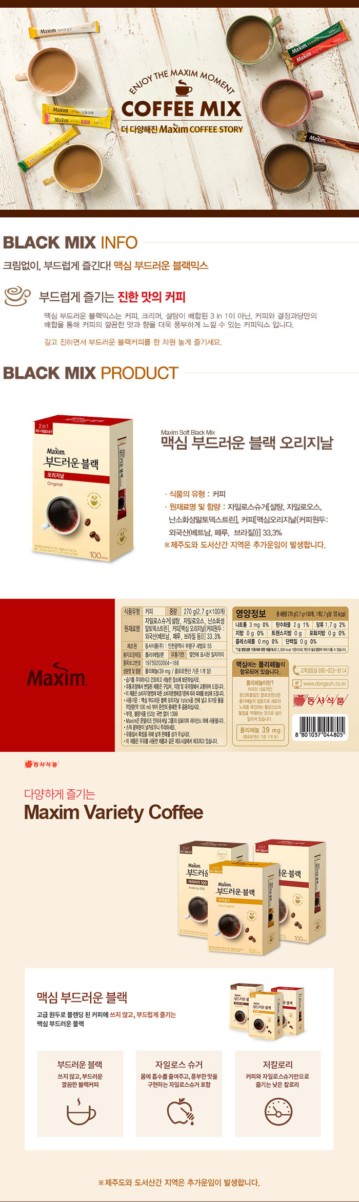 详细情报运营方针客户评论NOTICE* 商品外盒是为保护商品防止冲击而制作的,在包装/运输过程中可能会产生划痕及褶皱、变色等现象,该现象不能作为商品的退换理由。[DONGSEO] Maxim Original black Mix Coffee 2.7g 商品情报提供告示商品名 : [Maxim] Original black Mix Instant Coffee 2.7g*20EA原产地 : Korea制造/进口 : 质量保证标准 : 依照相关法律及消费者纠纷解决规定AS中心热线 : Ktown4u, 02-552-0978