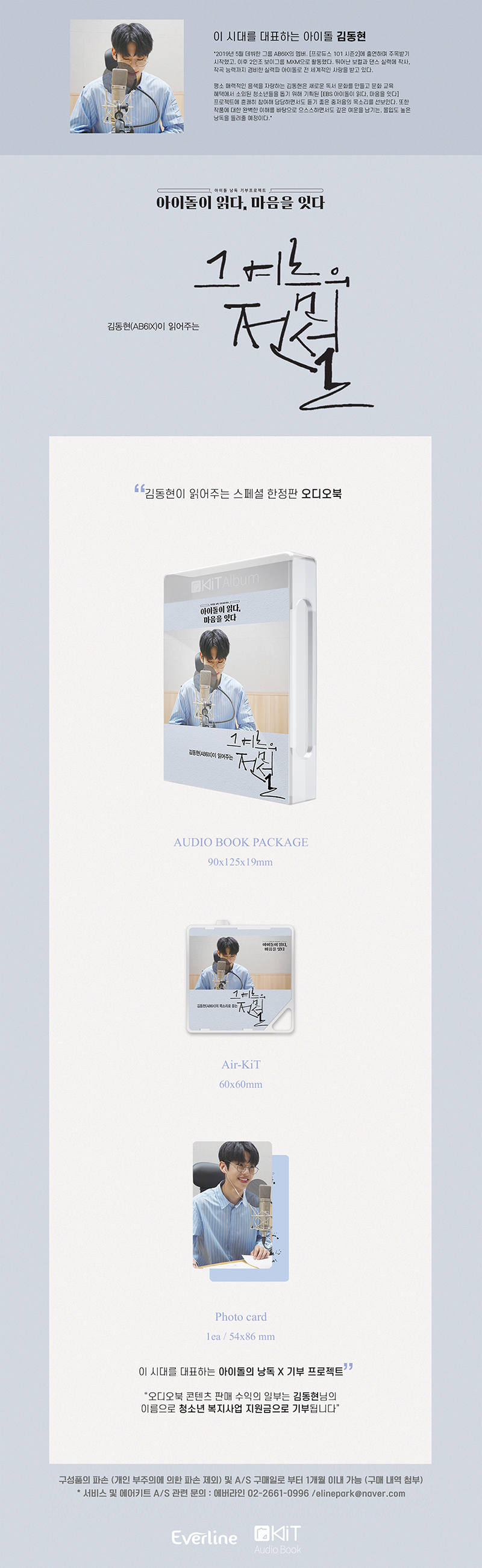 详细情报运营方针客户评论NOTICE* 商品外盒是为保护商品防止冲击而制作的,在包装/运输过程中可能会产生划痕及褶皱、变色等现象,该现象不能作为商品的退换理由。AB6IX : KIM DONG HYUN Kit Album [그 여름의 전설] PART * The outer case is just for protecting goods. (scratches and discoloration on the case can not be the reason for exchanging or returning) - AUDIO BOOK PACKAGE - AIR KIT - PHOTOCARD : 1p INFORMATION 商品情报提供告示商品名 : AB6IX : KIM DONG HYUN - Kit Album [그 여름의 전설] (Audio Book)原产地 : Korea制造/进口 : 에버라인质量保证标准 : 依照相关法律及消费者纠纷解决规定AS中心热线 : Ktown4u, 02-552-0978