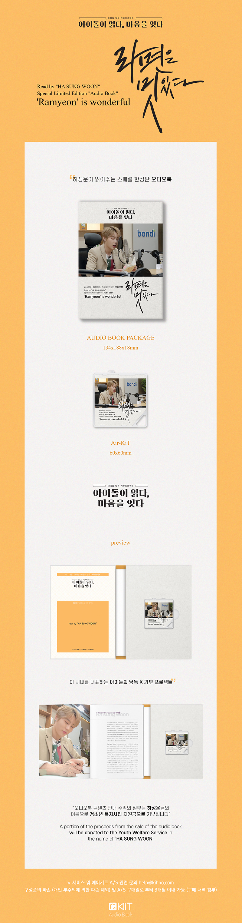 详细情报运营方针客户评论NOTICE* 商品外盒是为保护商品防止冲击而制作的,在包装/运输过程中可能会产生划痕及褶皱、变色等现象,该现象不能作为商品的退换理由。HA SUNG WOON Kit Album [라면은 멋있다] 스페셜 패키지 PART * The outer case is just for protecting goods. (scratches and discoloration on the case can not be the reason for exchanging or returning) - AUDIO BOOK PACKAGE - AIR KIT - PHOTOCARD : 1p INFORMATION 商品情报提供告示商品名 : HA SUNG WOON - Kit Album [라면은 멋있다] Special Peckage(Audio Book)原产地 : Korea制造/进口 : 에버라인质量保证标准 : 依照相关法律及消费者纠纷解决规定AS中心热线 : Ktown4u, 02-552-0978