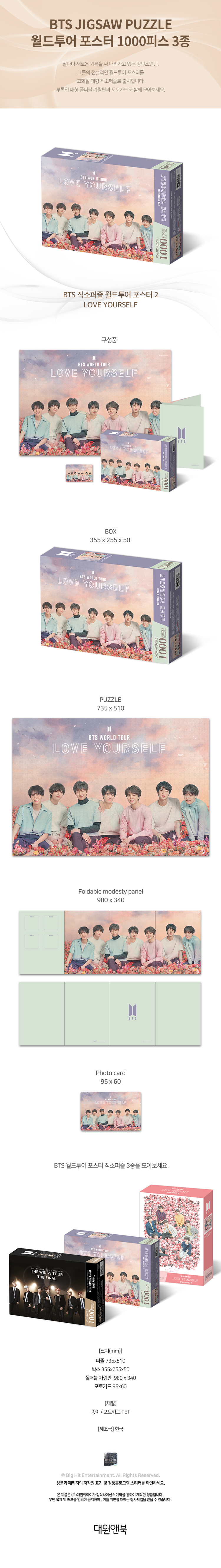 详细情报运营方针客户评论NOTICE* 商品外盒是为保护商品防止冲击而制作的,在包装/运输过程中可能会产生划痕及褶皱、变色等现象,该现象不能作为商品的退换理由。BTS Jigsaw Puzzle World Tour Poster 2 : LOVE YOURSELF PART * The outer case is just for protecting goods. (scratches and discoloration on the case can not be the reason for exchanging or returning) INFORMATION 商品情报提供告示商品名 : BTS - Jigsaw Puzzle World Tour Poster 2 : LOVE YOURSELF 原产地 : Korea制造/进口 : 대원앤북(대원씨아이) Big Hit Entertainment(예스24공급)质量保证标准 : 依照相关法律及消费者纠纷解决规定AS中心热线 : Ktown4u, 02-552-0978