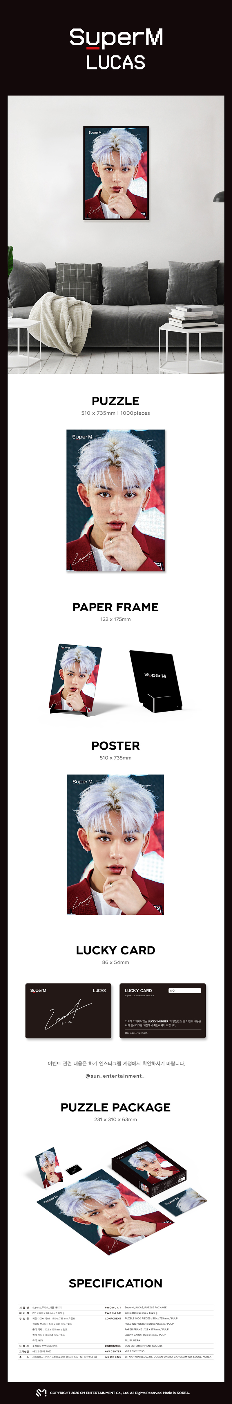 详细情报运营方针客户评论NOTICE* 商品外盒是为保护商品防止冲击而制作的,在包装/运输过程中可能会产生划痕及褶皱、变色等现象,该现象不能作为商品的退换理由。SuperM puzzle package (LUCAS ver) [Limited Edition] PART - OUT BOX - PUZZLE (1000piece) - Folded Poster - Paper Frame - Lucky Card INFORMATION 商品情报提供告示商品名 : SuperM - puzzle package (LUCAS ver) [Limited Edition]原产地 : Korea制造/进口 : (주)에스엠엔터테인먼트 (주)썬엔터테인먼트质量保证标准 : 依照相关法律及消费者纠纷解决规定AS中心热线 : Ktown4u, 02-552-0978