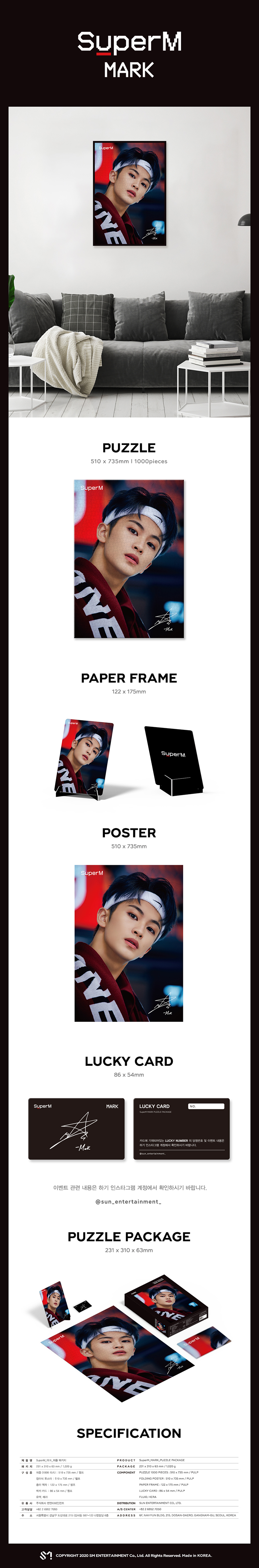 详细情报运营方针客户评论NOTICE* 商品外盒是为保护商品防止冲击而制作的,在包装/运输过程中可能会产生划痕及褶皱、变色等现象,该现象不能作为商品的退换理由。SuperM puzzle package (MARK ver) [Limited Edition] PART - OUT BOX - PUZZLE (1000piece) - Folded Poster - Paper Frame - Lucky Card INFORMATION 商品情报提供告示商品名 : SuperM - puzzle package (MARK ver) [Limited Edition]原产地 : Korea制造/进口 : (주)에스엠엔터테인먼트 (주)썬엔터테인먼트质量保证标准 : 依照相关法律及消费者纠纷解决规定AS中心热线 : Ktown4u, 02-552-0978