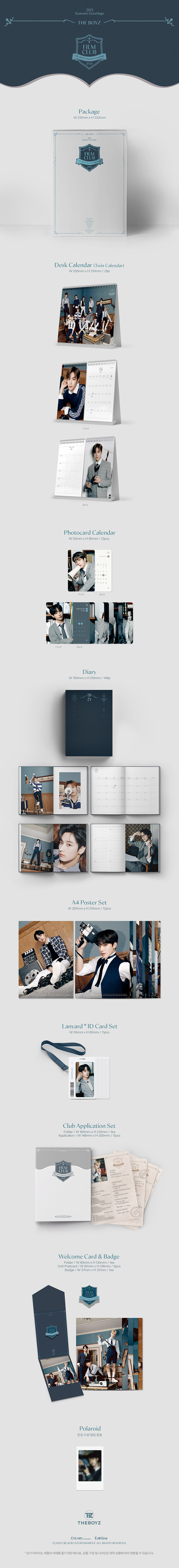 详细情报运营方针客户评论NOTICE* 商品外盒是为保护商品防止冲击而制作的,在包装/运输过程中可能会产生划痕及褶皱、变色等现象,该现象不能作为商品的退换理由。THE BOYZ 2021 Season’s Greetings [FILM CLUB] PART * The outer case is just for protecting goods. (scratches and discoloration on the case can not be the reason for exchanging or returning) 1. Desk Calendar 2. Photocard Calendar 3. Diary 4. A4 Poster Set 5. ID Card Set 6. Club Application Set 7. Welcome Card & Badge INFORMATION 商品情报提供告示商品名 : THE BOYZ - 2021 Season’s Greetings [FILM CLUB]原产地 : Korea制造/进口 : 에버라인质量保证标准 : 依照相关法律及消费者纠纷解决规定AS中心热线 : Ktown4u, 02-552-0978