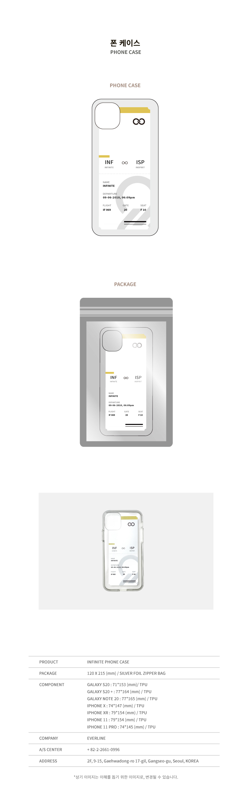 详细情报运营方针客户评论NOTICE* 商品外盒是为保护商品防止冲击而制作的,在包装/运输过程中可能会产生划痕及褶皱、变色等现象,该现象不能作为商品的退换理由。INFINITE INFINITE PHONE CASE PART * The outer case is just for protecting goods. (scratches and discoloration on the case can not be the reason for exchanging or returning) INFORMATION 商品情报提供告示商品名 : INFINITE - INFINITE PHONE CASE原产地 : Korea制造/进口 : 에버라인质量保证标准 : 依照相关法律及消费者纠纷解决规定AS中心热线 : Ktown4u, 02-552-0978