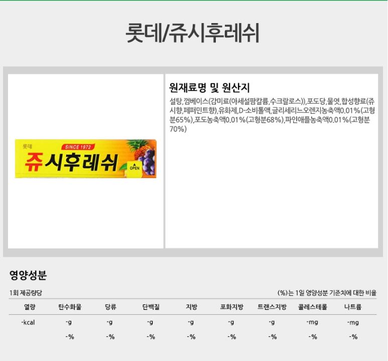 详细情报运营方针客户评论NOTICE* 商品外盒是为保护商品防止冲击而制作的,在包装/运输过程中可能会产生划痕及褶皱、变色等现象,该现象不能作为商品的退换理由。[LOTTE] juicy&fresh gum 26g 商品情报提供告示商品名 : [LOTTE] juicy&fresh gum 26g*1EA原产地 : Korea制造/进口 : 质量保证标准 : 依照相关法律及消费者纠纷解决规定AS中心热线 : Ktown4u, 02-552-0978