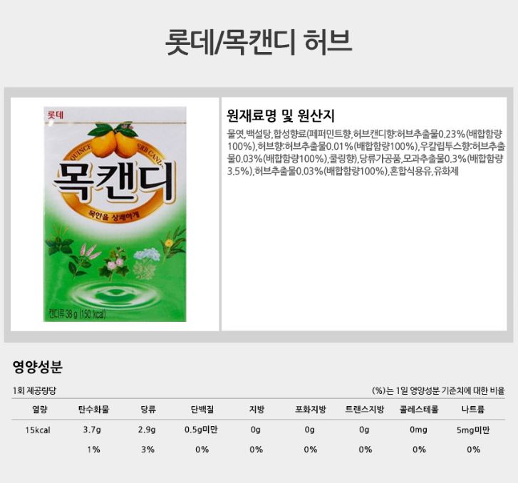 详细情报运营方针客户评论NOTICE* 商品外盒是为保护商品防止冲击而制作的,在包装/运输过程中可能会产生划痕及褶皱、变色等现象,该现象不能作为商品的退换理由。[LOTTE] Neck Candy hub 38g*1EA 商品情报提供告示商品名 : [LOTTE] Throat lozenges Herb Mint 38g*1EA原产地 : Korea制造/进口 : 质量保证标准 : 依照相关法律及消费者纠纷解决规定AS中心热线 : Ktown4u, 02-552-0978