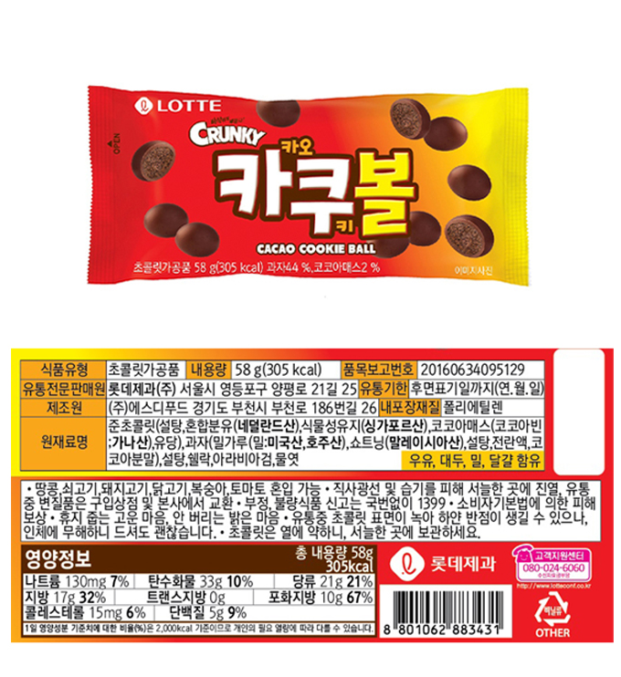 详细情报运营方针客户评论NOTICE* 商品外盒是为保护商品防止冲击而制作的,在包装/运输过程中可能会产生划痕及褶皱、变色等现象,该现象不能作为商品的退换理由。[LOTTE] Crunky Cacao Cookies Ball 58g 商品情报提供告示商品名 : [LOTTE] Crunky 可可巧克力球 58g*1EA原产地 : Korea制造/进口 : 质量保证标准 : 依照相关法律及消费者纠纷解决规定AS中心热线 : Ktown4u, 02-552-0978