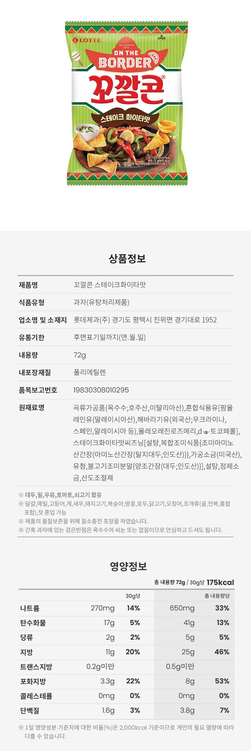 详细情报运营方针客户评论NOTICE* 商品外盒是为保护商品防止冲击而制作的,在包装/运输过程中可能会产生划痕及褶皱、变色等现象,该现象不能作为商品的退换理由。[LOTTE] Kkokkal corn Steak Fajitas flavor 72g*1EA 商品情报提供告示商品名 : [LOTTE] Kkokkal corn Steak Fajitas flavor 72g*1EA原产地 : Korea制造/进口 : 质量保证标准 : 依照相关法律及消费者纠纷解决规定AS中心热线 : Ktown4u, 02-552-0978