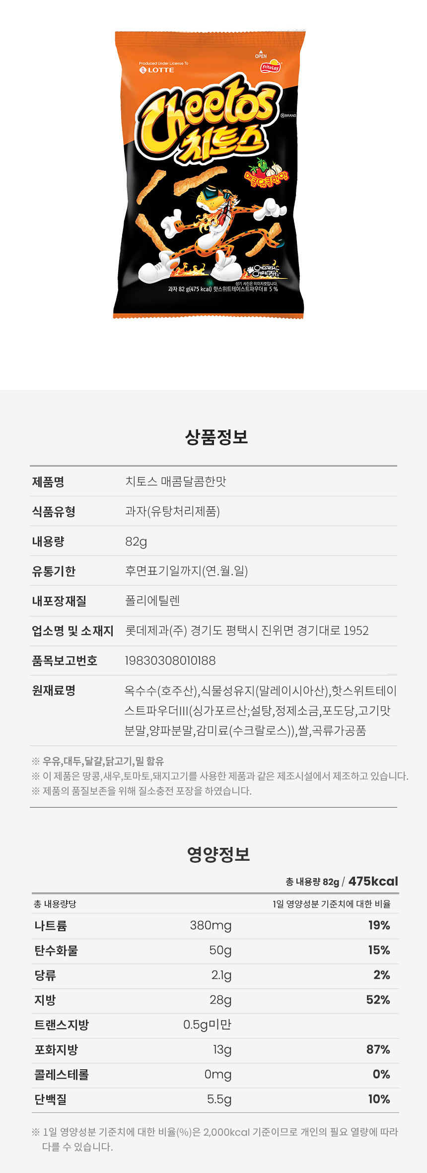 详细情报运营方针客户评论NOTICE* 商品外盒是为保护商品防止冲击而制作的,在包装/运输过程中可能会产生划痕及褶皱、变色等现象,该现象不能作为商品的退换理由。[LOTTE] CHEETOS Sweet Spicy flavor Small Size 82g*1EA *根据快递公司的配送政策,运费将根据商品实际重量和体积中较大的单位进行计算后可能会产生额外的运费。 商品情报提供告示商品名 : [LOTTE] CHEETOS Sweet Spicy flavor Small Size 82g*1EA原产地 : Korea制造/进口 : 质量保证标准 : 依照相关法律及消费者纠纷解决规定AS中心热线 : Ktown4u, 02-552-0978