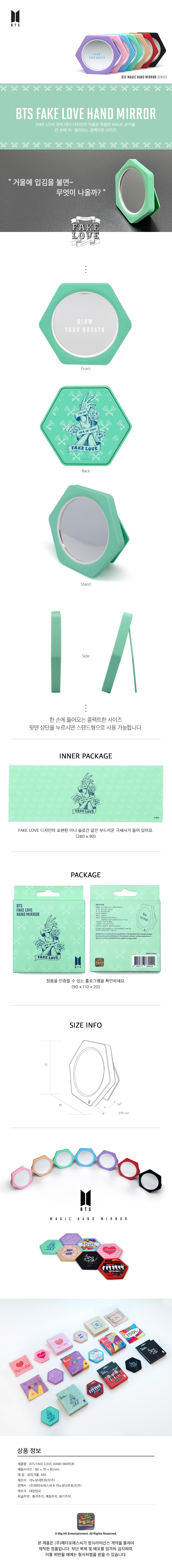 详细情报运营方针客户评论NOTICE* 商品外盒是为保护商品防止冲击而制作的,在包装/运输过程中可能会产生划痕及褶皱、变色等现象,该现象不能作为商品的退换理由。[BTS HAND MIRROR] BTS FAKE LOVE HAND MIRROR 商品情报提供告示商品名 : [BTS 手镜] BTS 防弹少年团 FAKE LOVE 手镜原产地 : Korea制造/进口 : 오앤에스미디어 오앤에스미디어质量保证标准 : 依照相关法律及消费者纠纷解决规定AS中心热线 : Ktown4u, 02-552-0978