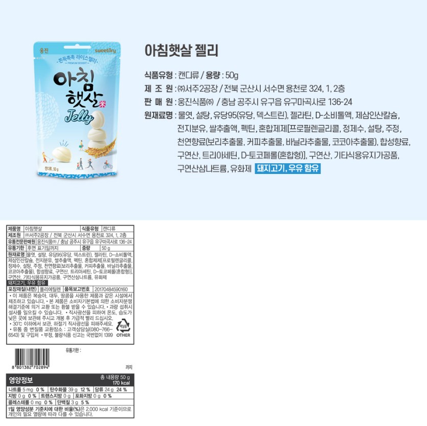 详细情报运营方针客户评论NOTICE* 商品外盒是为保护商品防止冲击而制作的,在包装/运输过程中可能会产生划痕及褶皱、变色等现象,该现象不能作为商品的退换理由。[WOONJIN] Morning sun jelly 50g*1EA 商品情报提供告示商品名 : [WOONJIN] Morning sun jelly 50g*1EA原产地 : Korea制造/进口 : 质量保证标准 : 依照相关法律及消费者纠纷解决规定AS中心热线 : Ktown4u, 02-552-0978