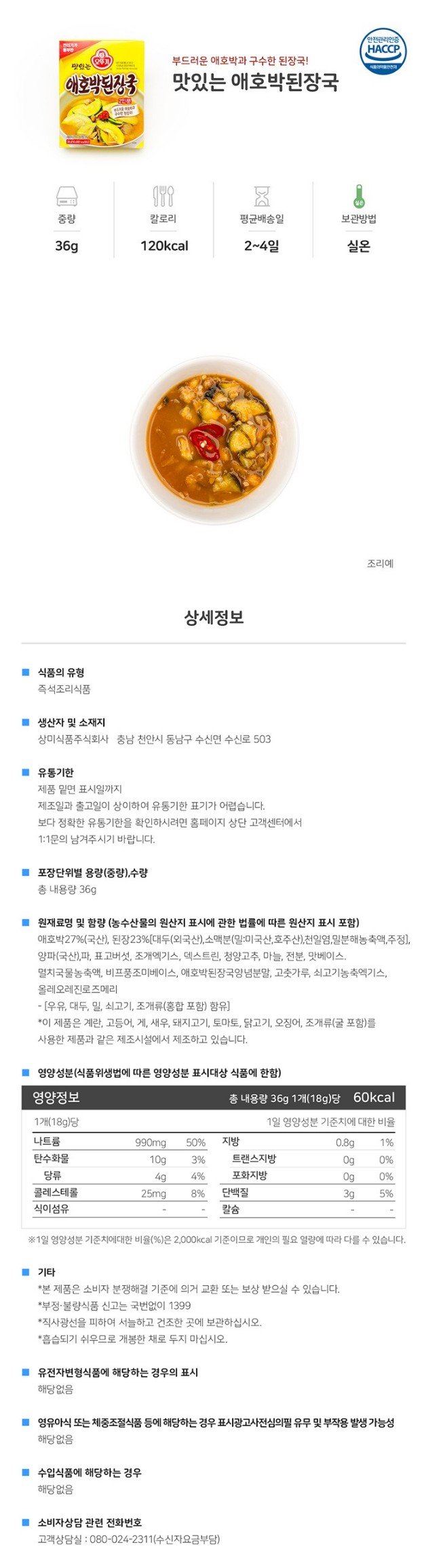 详细情报运营方针客户评论NOTICE* 商品外盒是为保护商品防止冲击而制作的,在包装/运输过程中可能会产生划痕及褶皱、变色等现象,该现象不能作为商品的退换理由。[OTTOGI] Soybean paste soup with Green pumpkin 36g*1EA 商品情报提供告示商品名 : [OTTOGI] Soybean paste soup with Green pumpkin 36g*1EA原产地 : Korea制造/进口 : 质量保证标准 : 依照相关法律及消费者纠纷解决规定AS中心热线 : Ktown4u, 02-552-0978