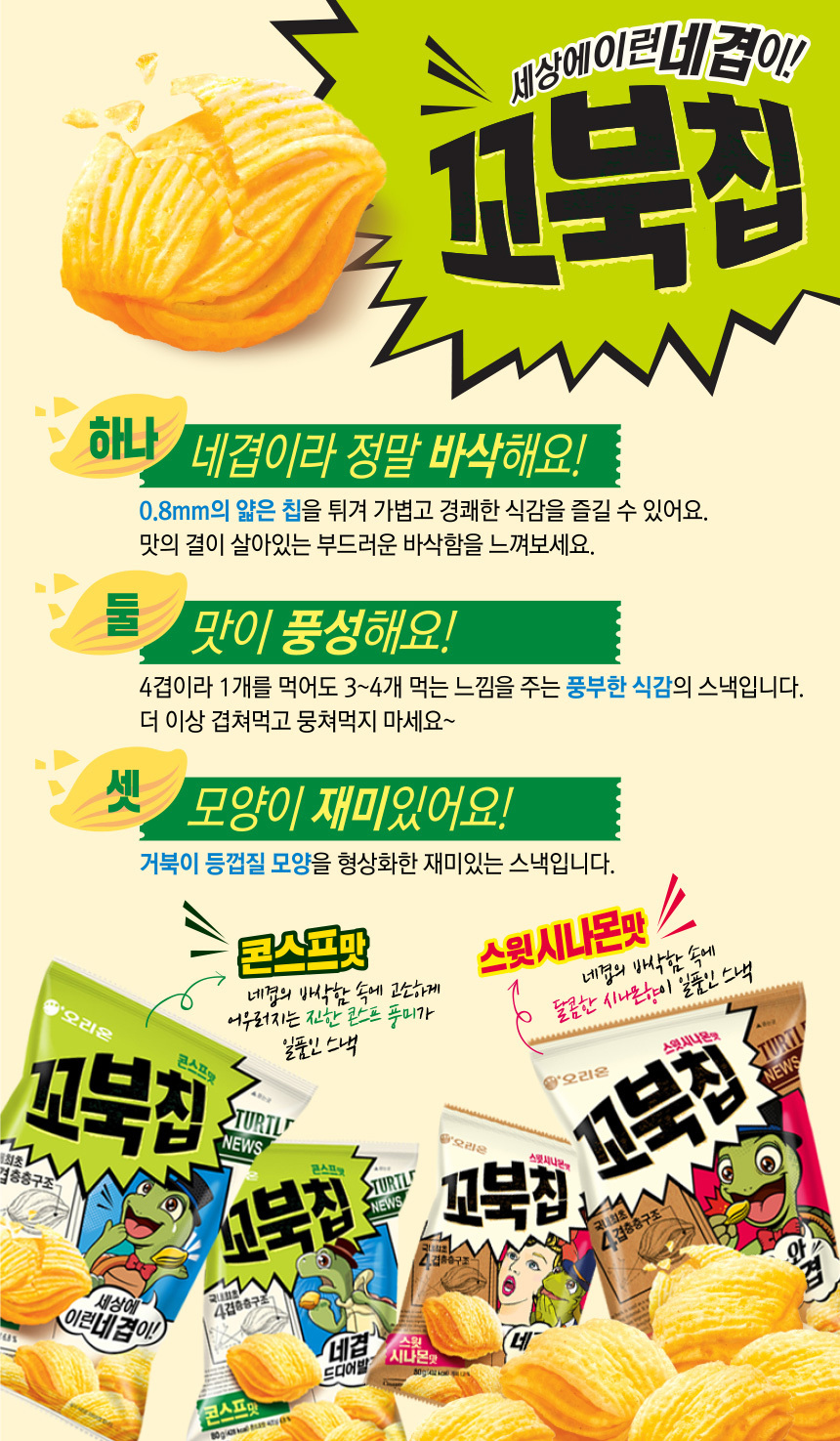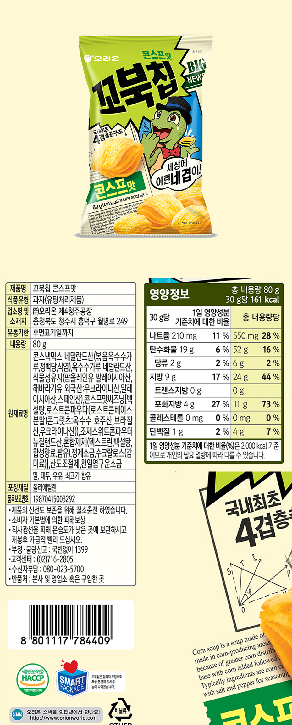 详细情报运营方针客户评论NOTICE* 商品外盒是为保护商品防止冲击而制作的,在包装/运输过程中可能会产生划痕及褶皱、变色等现象,该现象不能作为商品的退换理由。[ORION] Kkobuk Chip Corn Soup flavor 80g*1EA 商品情报提供告示商品名 : [ORION] Kkobuk Chip Corn Soup flavor 80g*1EA原产地 : Korea制造/进口 : 质量保证标准 : 依照相关法律及消费者纠纷解决规定AS中心热线 : Ktown4u, 02-552-0978