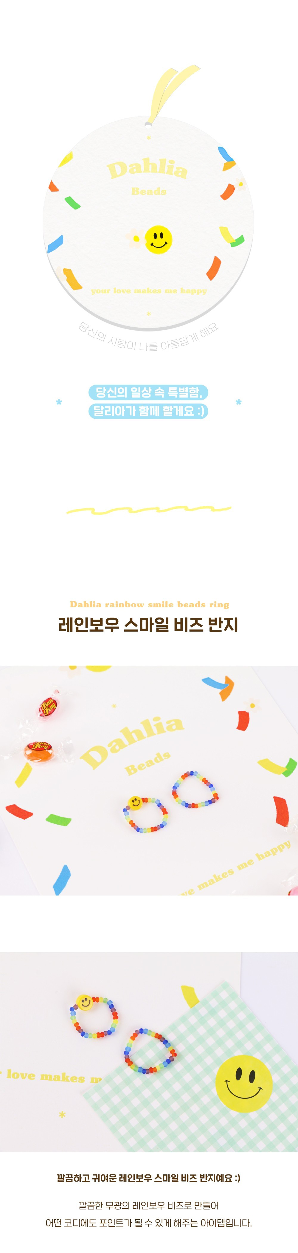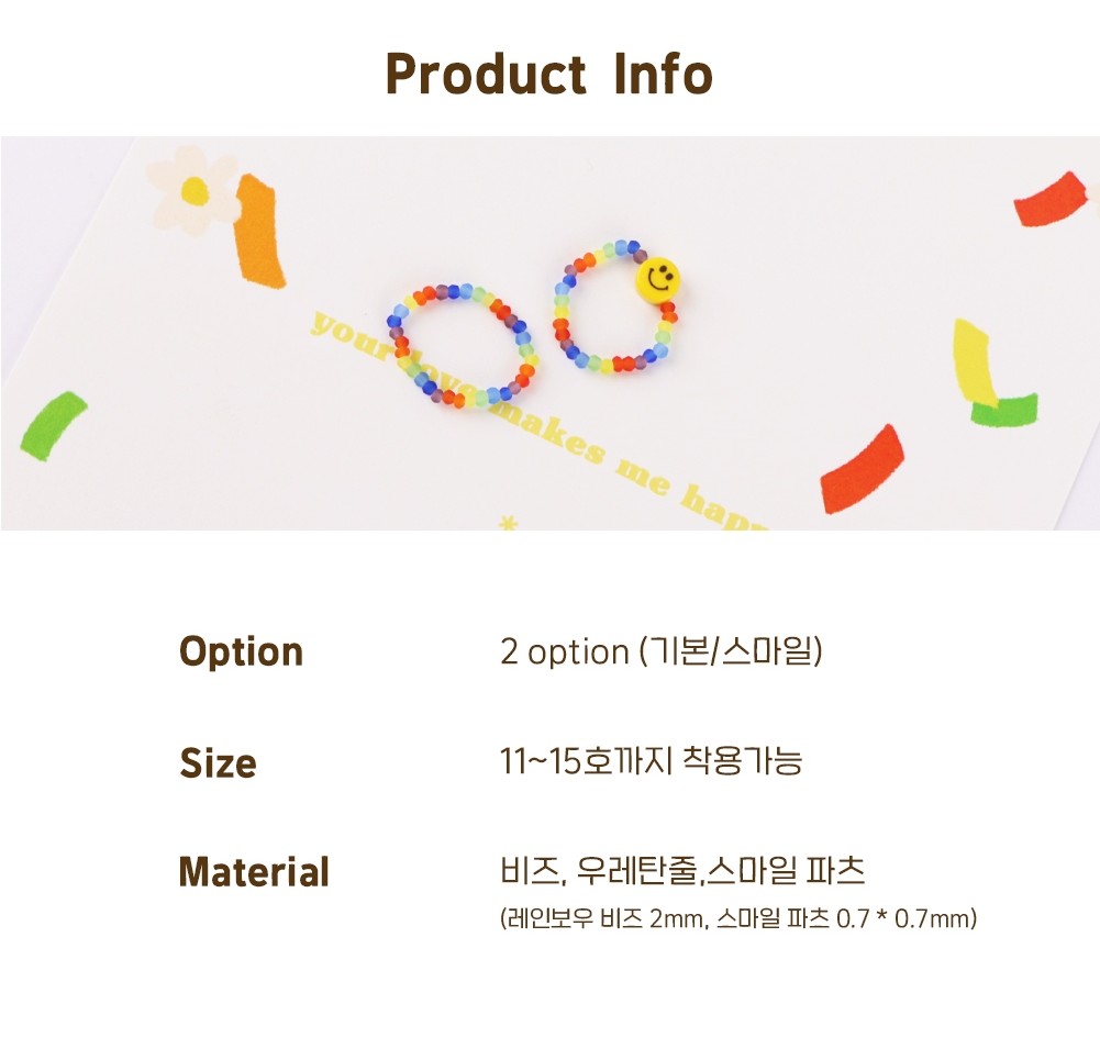 详细情报运营方针客户评论NOTICE* 商品外盒是为保护商品防止冲击而制作的,在包装/运输过程中可能会产生划痕及褶皱、变色等现象,该现象不能作为商品的退换理由。Rainbow Smile beads ring 商品情报提供告示商品名 : Rainbow Smile beads ring原产地 : Korea制造/进口 : GODSHOP质量保证标准 : 依照相关法律及消费者纠纷解决规定AS中心热线 : Ktown4u, 02-552-0978