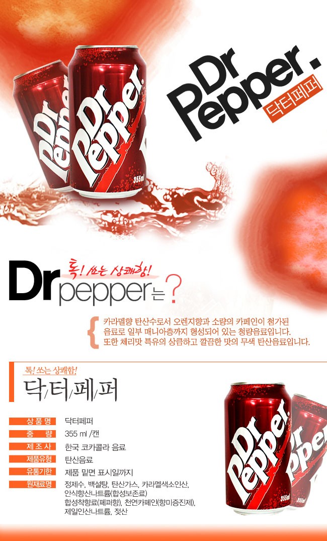 详细情报运营方针客户评论NOTICE* 商品外盒是为保护商品防止冲击而制作的,在包装/运输过程中可能会产生划痕及褶皱、变色等现象,该现象不能作为商品的退换理由。Dr Pepper 355ml*1EA 商品情报提供告示商品名 : Dr Pepper 355ml*1EA原产地 : Korea制造/进口 : 质量保证标准 : 依照相关法律及消费者纠纷解决规定AS中心热线 : Ktown4u, 02-552-0978