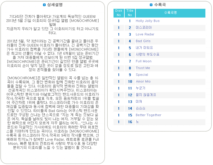 详细情报运营方针客户评论NOTICE* 商品外盒是为保护商品防止冲击而制作的,在包装/运输过程中可能会产生划痕及褶皱、变色等现象,该现象不能作为商品的退换理由。商品情报提供告示商品名 : Lee Hyo Ri - Vol.5 [MONOCHROME] (Normal Edition)原产地 : Korea制造/进口 : 质量保证标准 : 依照相关法律及消费者纠纷解决规定AS中心热线 : Ktown4u, 02-552-0978