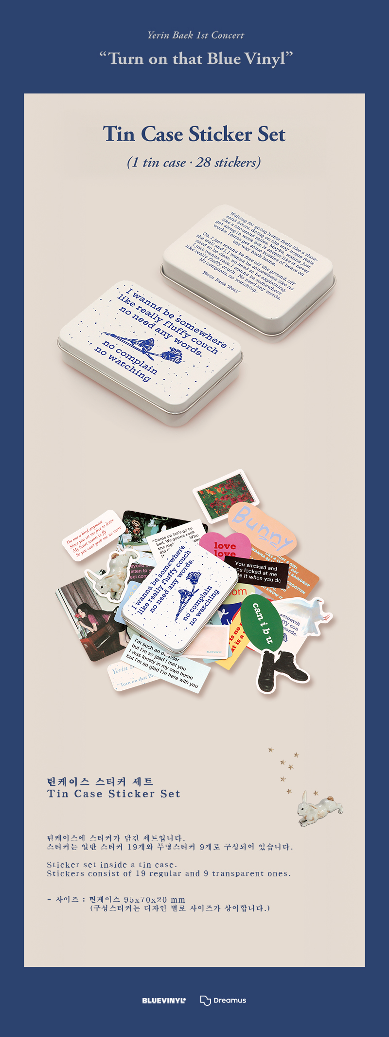 详细情报运营方针客户评论NOTICE* 商品外盒是为保护商品防止冲击而制作的,在包装/运输过程中可能会产生划痕及褶皱、变色等现象,该现象不能作为商品的退换理由。Baek Ye Rin Turn on that Blue Vinyl Tin Case Sticker Set PART * The outer case is just for protecting goods. (scratches and discoloration on the case can not be the reason for exchanging or returning) - 尺寸(mm): 95 x 70 x 20 (贴纸的尺寸根据设计,大小会存在差异,具体商品以实物为主.) * to buy poster, please select the poster option INFORMATION 商品情报提供告示商品名 : 白艺潾- Turn on that Blue Vinyl 锡盒贴纸套装原产地 : Korea制造/进口 : (주)드림어스컴퍼니 (주)드림어스컴퍼니质量保证标准 : 依照相关法律及消费者纠纷解决规定AS中心热线 : Ktown4u, 02-552-0978