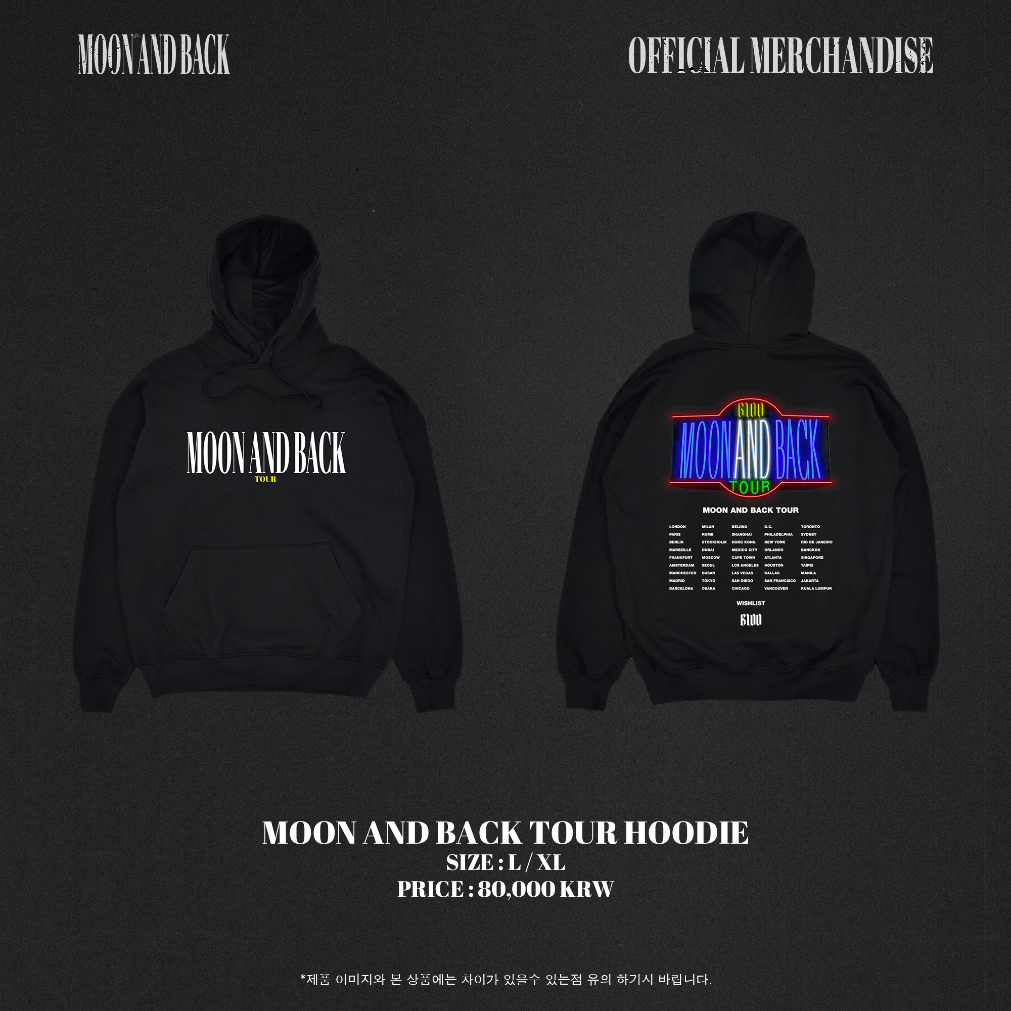 详细情报运营方针客户评论NOTICE* 商品外盒是为保护商品防止冲击而制作的,在包装/运输过程中可能会产生划痕及褶皱、变色等现象,该现象不能作为商品的退换理由。BLOO Hoodie [MOON AND BACK TOUR] PART * The outer case is just for protecting goods. (scratches and discoloration on the case can not be the reason for exchanging or returning) SIZE : L / XL COLOR : BLACK INFORMATION 商品情报提供告示商品名 : BLOO - Hoodie [MOON AND BACK TOUR]原产地 : Korea制造/进口 : 质量保证标准 : 依照相关法律及消费者纠纷解决规定AS中心热线 : Ktown4u, 02-552-0978