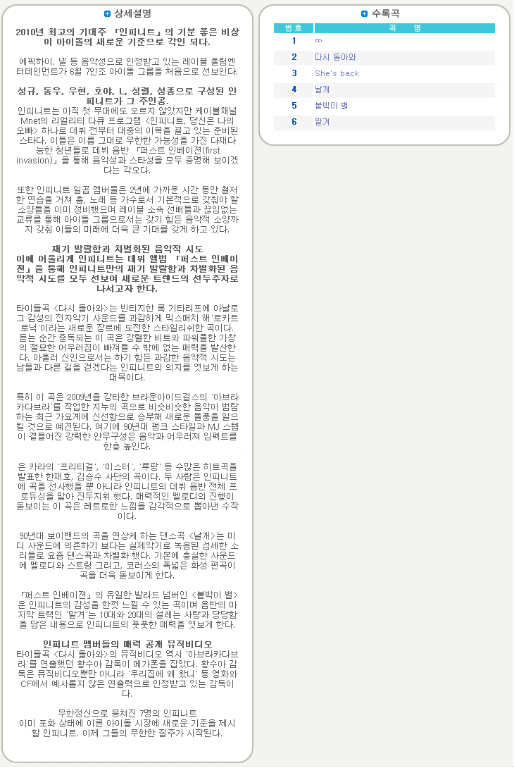 详细情报运营方针客户评论NOTICE* 商品外盒是为保护商品防止冲击而制作的,在包装/运输过程中可能会产生划痕及褶皱、变色等现象,该现象不能作为商品的退换理由。商品情报提供告示商品名 : Infinite - 迷你专辑 Vol.1 [First Invasion]原产地 : Korea制造/进口 : 质量保证标准 : 依照相关法律及消费者纠纷解决规定AS中心热线 : Ktown4u, 02-552-0978