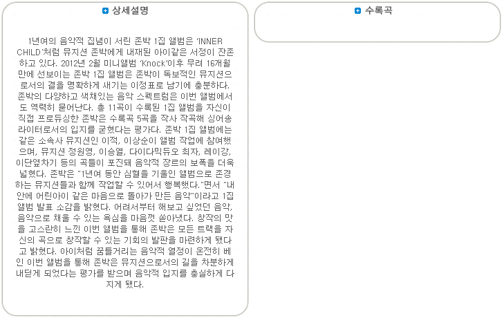 详细情报运营方针客户评论NOTICE* 商品外盒是为保护商品防止冲击而制作的,在包装/运输过程中可能会产生划痕及褶皱、变色等现象,该现象不能作为商品的退换理由。商品情报提供告示商品名 : John Park - Vol.1 [Inner Child] 原产地 : Korea制造/进口 : 质量保证标准 : 依照相关法律及消费者纠纷解决规定AS中心热线 : Ktown4u, 02-552-0978