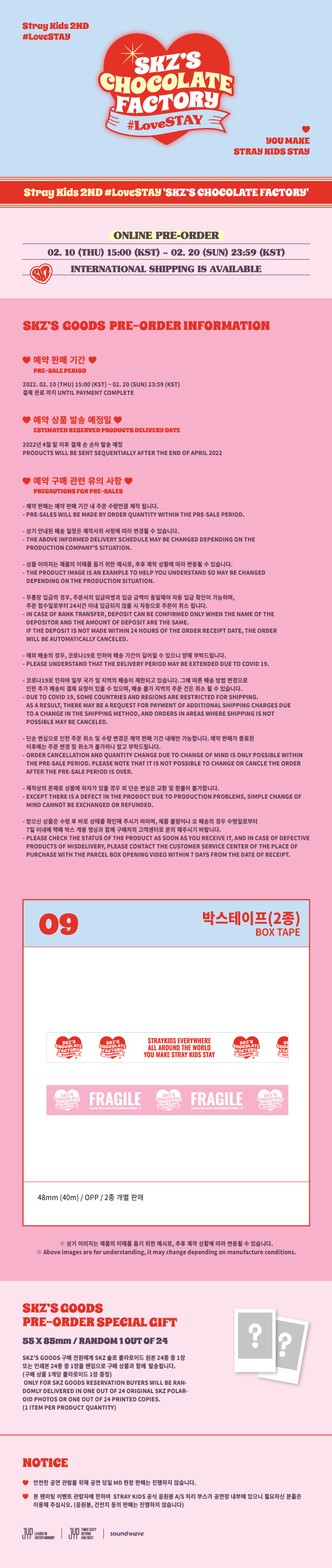 详细情报运营方针客户评论NOTICE* 商品外盒是为保护商品防止冲击而制作的,在包装/运输过程中可能会产生划痕及褶皱、变色等现象,该现象不能作为商品的退换理由。Stray Kids - BOX TAPE [2ND #LoveSTAY 'SKZ'S CHOCOLATE FACTORY'] PART * 아웃박스는 상품 보호를 위한 충격 방지용으로 제작되어 미세한 스크래치 및 흠집, 변색 등이 포장/배송 과정에서 생겨날 수 있고 이는 교환 사유가 될 수 없습니다. * The outer case is just for protecting goods. (scratches and discoloration on the case can not be the reason for exchanging or returning) INFORMATION 商品情报提供告示商品名 : Stray Kids - 胶带 [2ND #LoveSTAY 'SKZ'S CHOCOLATE FACTORY'] 原产地 : Korea制造/进口 : 사운드웨이브质量保证标准 : 依照相关法律及消费者纠纷解决规定AS中心热线 : Ktown4u, 02-552-0978