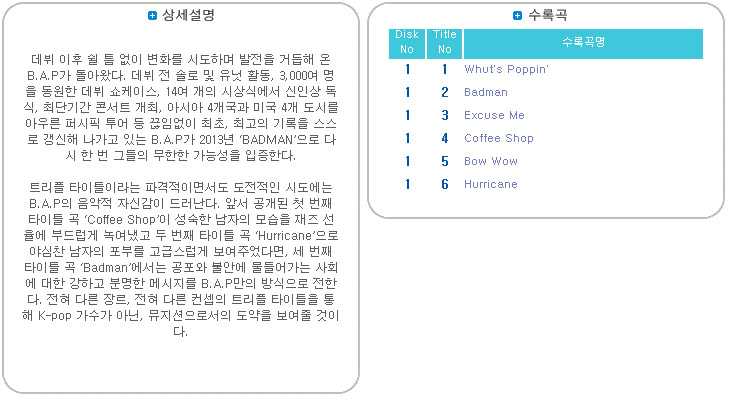 详细情报运营方针客户评论NOTICE* 商品外盒是为保护商品防止冲击而制作的,在包装/运输过程中可能会产生划痕及褶皱、变色等现象,该现象不能作为商品的退换理由。+Photocard 1p (random image)商品情报提供告示商品名 : B.A.P - 迷你3辑 [Badman] 原产地 : Korea制造/进口 : 质量保证标准 : 依照相关法律及消费者纠纷解决规定AS中心热线 : Ktown4u, 02-552-0978