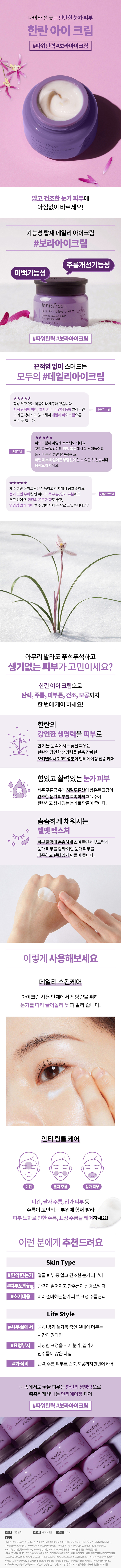 详细情报运营方针客户评论NOTICE* 商品外盒是为保护商品防止冲击而制作的,在包装/运输过程中可能会产生划痕及褶皱、变色等现象,该现象不能作为商品的退换理由。[innisfree] Jeju Orchid Eye Cream PART * 아웃박스는 상품 보호를 위한 충격 방지용으로 제작되어 미세한 스크래치 및 흠집, 변색 등이 포장/배송 과정에서 생겨날 수 있고 이는 교환 사유가 될 수 없습니다. * The outer case is just for protecting goods. (scratches and discoloration on the case can not be the reason for exchanging or returning) INFORMATION 商品情报提供告示商品名 : 【悦诗风吟】营养保湿抗皱提亮眼霜 30ml原产地 : Korea制造/进口 : 아네시(Annecy) 아네시(Annecy)质量保证标准 : 依照相关法律及消费者纠纷解决规定AS中心热线 : Ktown4u, 02-552-0978
