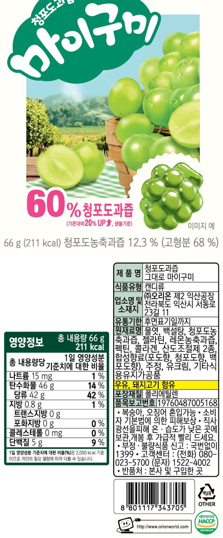 详细情报运营方针客户评论NOTICE* 商品外盒是为保护商品防止冲击而制作的,在包装/运输过程中可能会产生划痕及褶皱、变色等现象,该现象不能作为商品的退换理由。ORION My gummy Jelly green grape flavoured PART * 아웃박스는 상품 보호를 위한 충격 방지용으로 제작되어 미세한 스크래치 및 흠집, 변색 등이 포장/배송 과정에서 생겨날 수 있고 이는 교환 사유가 될 수 없습니다. * The outer case is just for protecting goods. (scratches and discoloration on the case can not be the reason for exchanging or returning) 66g*1ea INFORMATION 商品情报提供告示商品名 : 好丽友果滋果心 青葡萄味66g*1ea原产地 : Korea制造/进口 : 质量保证标准 : 依照相关法律及消费者纠纷解决规定AS中心热线 : Ktown4u, 02-552-0978