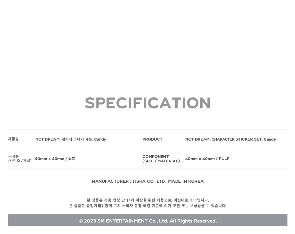 详细情报运营方针客户评论NOTICE* 商品外盒是为保护商品防止冲击而制作的,在包装/运输过程中可能会产生划痕及褶皱、变色等现象,该现象不能作为商品的退换理由。NCT DREAM CHARACTER STICKER [Candy] PART * 아웃박스는 상품 보호를 위한 충격 방지용으로 제작되어 미세한 스크래치 및 흠집, 변색 등이 포장/배송 과정에서 생겨날 수 있고 이는 교환 사유가 될 수 없습니다. * The outer case is just for protecting goods. (scratches and discoloration on the case can not be the reason for exchanging or returning). INFORMATION 商品情报提供告示商品名 : NCT DREAM - CHARACTER STICKER_Candy原产地 : Korea制造/进口 : 티스카质量保证标准 : 依照相关法律及消费者纠纷解决规定AS中心热线 : Ktown4u, 02-552-0978