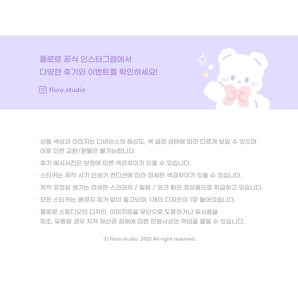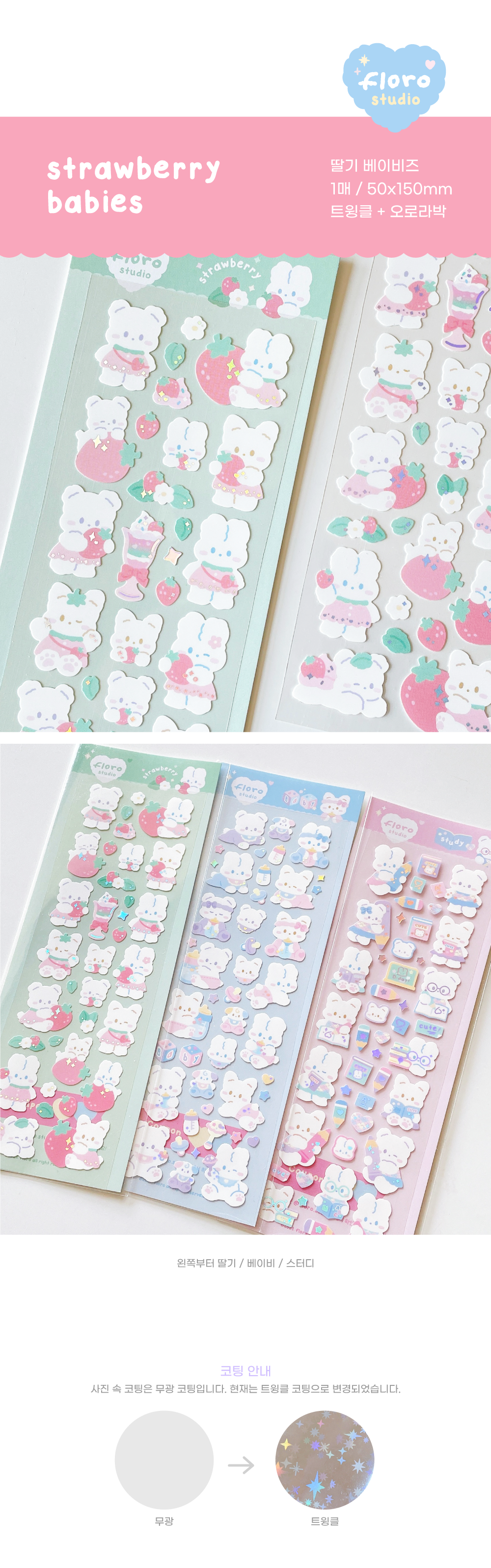 详细情报运营方针客户评论NOTICE* 商品外盒是为保护商品防止冲击而制作的,在包装/运输过程中可能会产生划痕及褶皱、变色等现象,该现象不能作为商品的退换理由。floro studio Strawberry Sticker PART ・根据设备的分辨率,颜色设定的不同,商品颜色和图片看起来可能略有差异,这点无法成为交换/退款的理由。 ・后期示例照片因为修图颜色可能会有差异 ・贴纸根据制作时印刷机的状态会有细微的色感差异 ・制作工序中产生的细微划痕/挤压/喷墨等均视为正常 ・所有贴纸均不去除背景纸出库,每个设计里含有1张背景纸 INFORMATION 商品情报提供告示商品名 : floro Strawberry Sticker原产地 : Korea制造/进口 : 플로로 스튜디오 플로로 스튜디오质量保证标准 : 依照相关法律及消费者纠纷解决规定AS中心热线 : Ktown4u, 02-552-0978