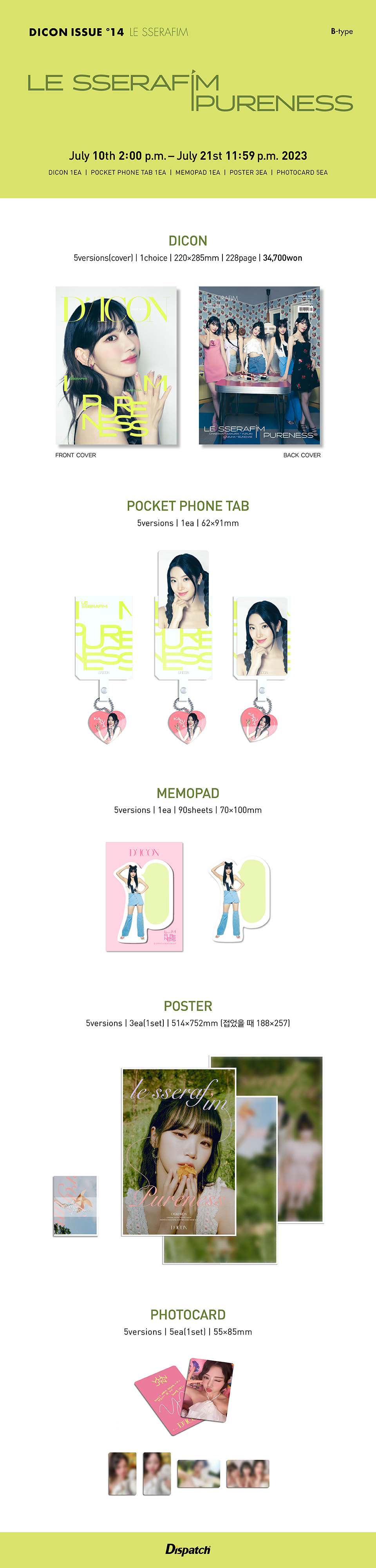 详细情报运营方针客户评论NOTICE* 商品外盒是为保护商品防止冲击而制作的,在包装/运输过程中可能会产生划痕及褶皱、变色等现象,该现象不能作为商品的退换理由。DICON ISSUE N°14 : LE SSERAFIM PURENESS B-type PART ① DICON 5versions(cover) | 1choice | 220×285mm | 228page | 재질 - paper ② POCKET PHONE TAB 5versions | 1ea | 62×91mm 재질 - pvc, acrylic ③ MEMOPAD 5versions | 1ea | 90sheets | 70×100mm 재질 - paper ④ POSTER 5versions | 3ea(1set) | 514×752mm (접었을 때 188×257) 재질 - paper ⑤ PHOTOCARD 5versions | 5ea(1set) | 55×85mm 재질 - paper INFORMATION 商品情报提供告示商品名 : DICON ISSUE N°14 : LE SSERAFIM PURENESS B-type (CHAEWON)原产地 : Korea制造/进口 : (주)디스패치质量保证标准 : 依照相关法律及消费者纠纷解决规定AS中心热线 : Ktown4u, 02-552-0978