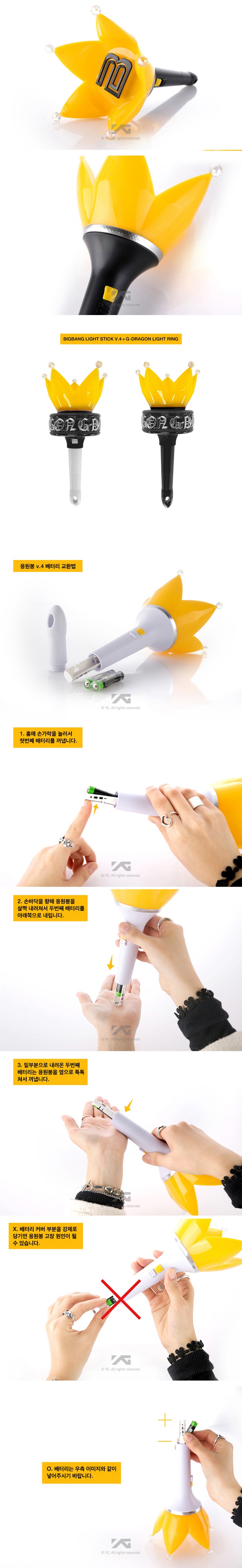 详细情报运营方针客户评论NOTICE* 商品外盒是为保护商品防止冲击而制作的,在包装/运输过程中可能会产生划痕及褶皱、变色等现象,该现象不能作为商品的退换理由。Because of delivery issue, we can ship out without battery, Please note it. * The outer case is to protect goods. (scratches and discoloration will not be the case for exchange or return.) * Size: 13.5*13.5 *26.5cm * Qty that we can put in one box of each shipment. (only light stick) - Small Packet (Air): 3p - Parcel: 8p - EMS: 15p (EMS Box. no6) / 20p (YG Box) 商品情报提供告示商品名 : Big Bang - OFFICIAL LIGHT STICK Ver.4 (White)原产地 : Korea制造/进口 : 와이지플러스质量保证标准 : 依照相关法律及消费者纠纷解决规定AS中心热线 : Ktown4u, 02-552-0978