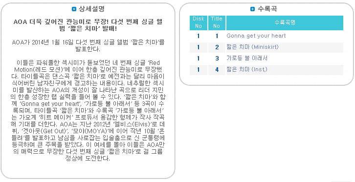 详细情报运营方针客户评论NOTICE* 商品外盒是为保护商品防止冲击而制作的,在包装/运输过程中可能会产生划痕及褶皱、变色等现象,该现象不能作为商品的退换理由。 商品情报提供告示商品名 : AOA - 单曲专辑 Vol.5 [Short Skirts] 原产地 : Korea制造/进口 : 质量保证标准 : 依照相关法律及消费者纠纷解决规定AS中心热线 : Ktown4u, 02-552-0978