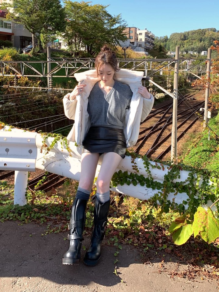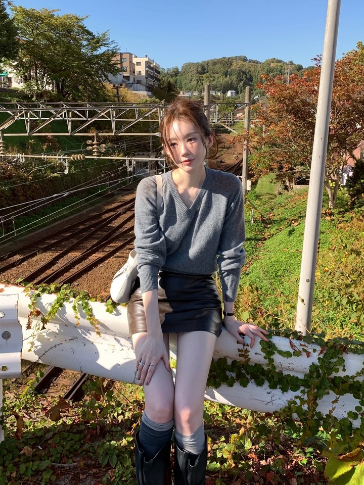 11月25日、カン・ミンギョンは自身のSNSにコメントを添えず複数の写真を投稿した。公開された写真で彼女は、グレーのVネックニットとブラックのレザーミニスカートを組み合わせたシンプルかつシックな秋のコーディネートを披露した。