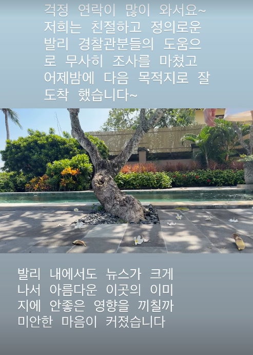 이어 "발리내에서도 뉴스가 크게 나서 아름다운 이곳의 이미지에 안좋은 영향을 끼칠까 미안한 마음이 커졌다"고 심경을 토로했다.