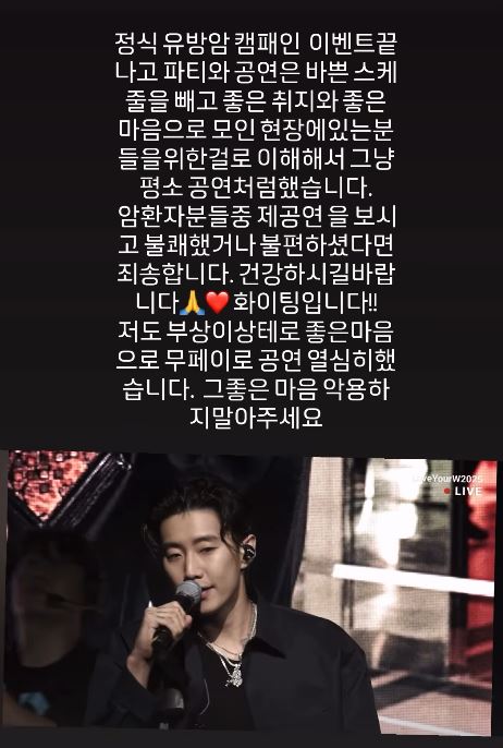 박재범은 16일 자신의 SNS에 "유방암 캠페인 이벤트 끝나고 파티와 공연은 좋은 취지와 마음으로 모인 분들을 위한 걸로 이해해서 평소처럼 공연했다"며 "암환자분들 중 공연을 보시고 불쾌했거나 불편하셨다면 죄송하다. 건강하시길 바란다"고 사과문을 게재했다.