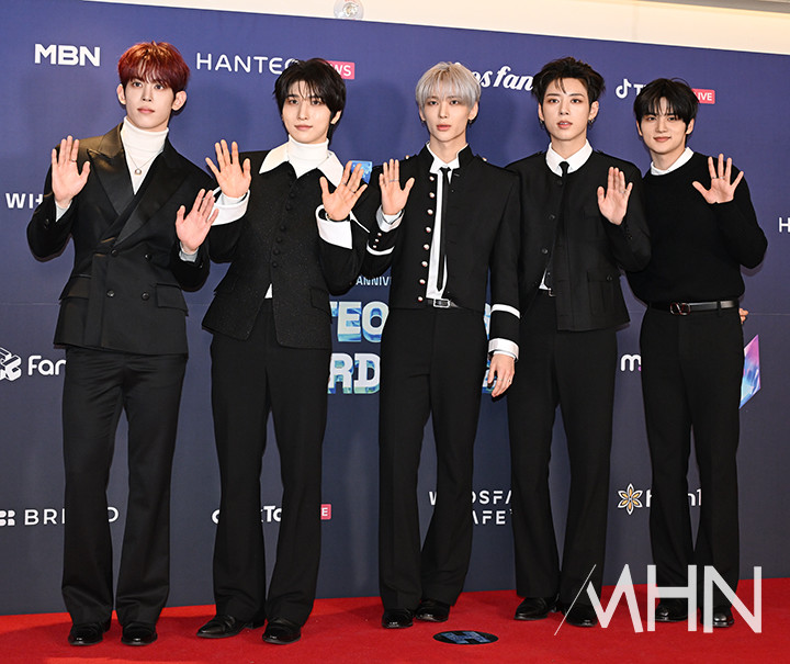 (MHN 이현지 기자) 그룹 나우즈(NOWZ)가 15일 오후 서울 송파구 올림픽공원 KSPO돔에서 진행된 '33주년 한터뮤직어워즈 2025' 레드카펫에 참석해 포토타임을 갖고 있다.