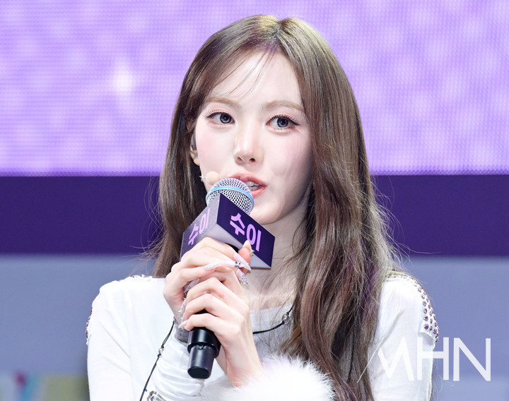 (MHN 이지숙 기자) 그룹 키키(KiiiKiii) 수이가 26일 오후 서울 광진구 예스24라이브홀에서 열린 미니 2집 ‘델룰루 팩(Delulu Pack)’ 발매 기념 쇼케이스에서 질의응답 시간을 가지고 있다.