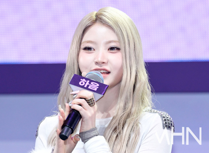 (MHN 이지숙 기자) 그룹 키키(KiiiKiii) 하음이 26일 오후 서울 광진구 예스24라이브홀에서 열린 미니 2집 ‘델룰루 팩(Delulu Pack)’ 발매 기념 쇼케이스에서 질의응답 시간을 가지고 있다.
